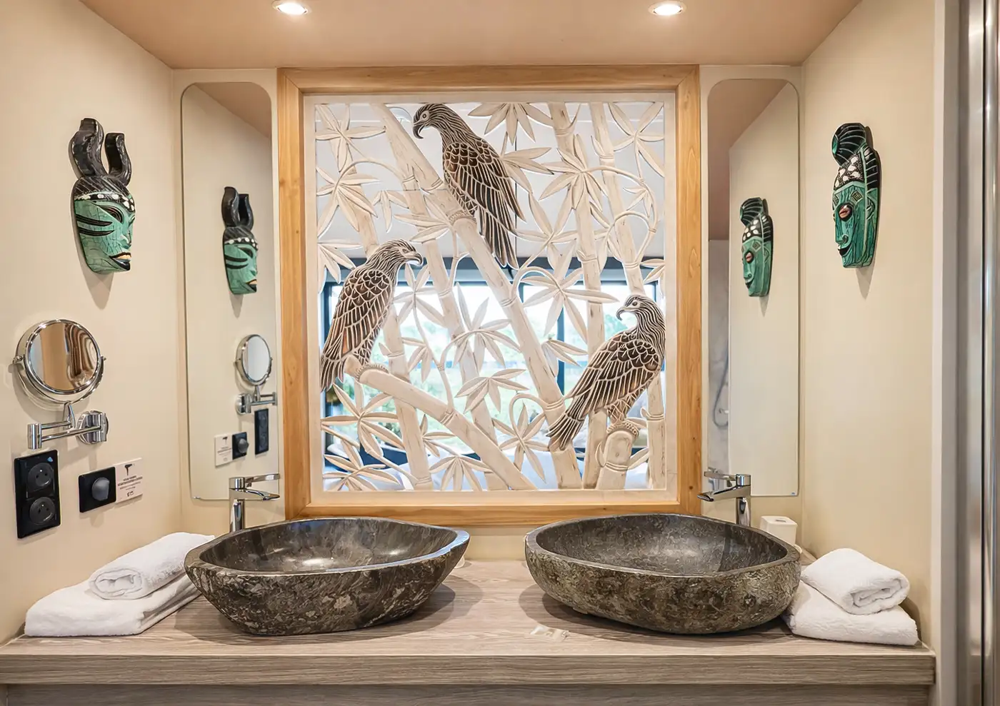 La chambre a été pensée pour les séjours à deux. Le lit king size invite à la détente, tandis que les volumes et la décoration créent une atmosphère à la fois chaleureuse et soignée. La salle de bain spacieuse, équipée d’une double vasque et sublimée par une plaque en bois sculpté, prolonge cette sensation de confort et de qualité.