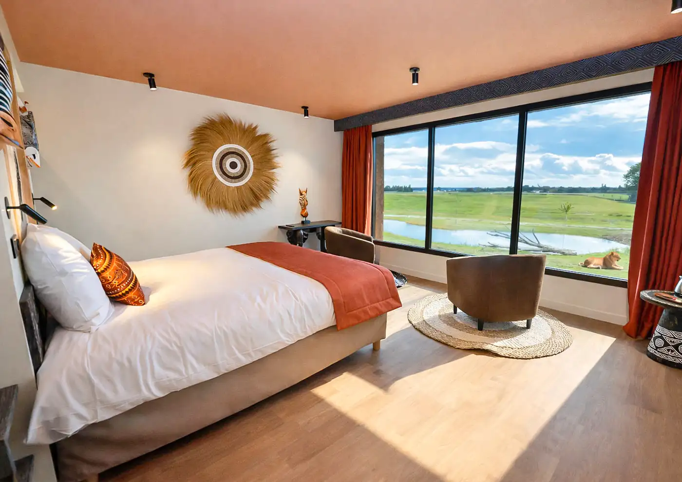 Entrer dans la Chambre Premium, c’est faire le choix d’un séjour à part. L’espace est généreux, le confort immédiat, et tr ès vite, le regard est attiré par les immenses baies vitrées qui ouvrent directement sur le territoire des lions. Un paysage naturel de 40 000 m² s’étend devant vous, composé de vallons, de points d’eau et de végétation, où évolue un groupe de lions, visibles de jour comme de nuit.